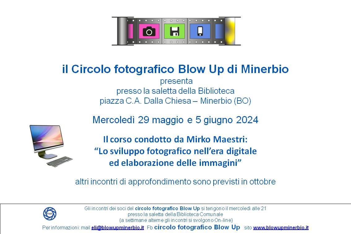 Il Circolo fotografico Blow up presenta mercoledì 29 maggio e 5 giugno 2024 nella sala multimediale della Biblioteca comunale di Minerbio alle ore 21.00 il corso condotto da Mirko Maestri: Lo sviluppo fotografico nella era digitale ed elaborazione delle immagini.
