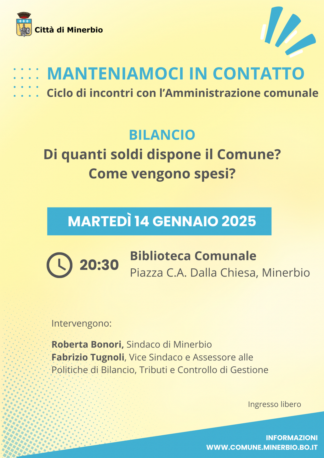 Martedì 14 gennaio 2025, alle ore 20.30 presso la sala Multimediale della Biblioteca Comunale Prometeo di Minerbio, si terrà il secondo appuntamento dal titolo: " Bilancio: di quanti soldi dispone il Comune? Come vengono spesi?" del ciclo di 7 incontri "Manteniamoci in contatto" che si tengono da dicembre 2024 a giugno 2025, il secondo martedì di ogni mese, per un confronto con l'Amministrazione sui temi di maggiore interesse per i cittadini.