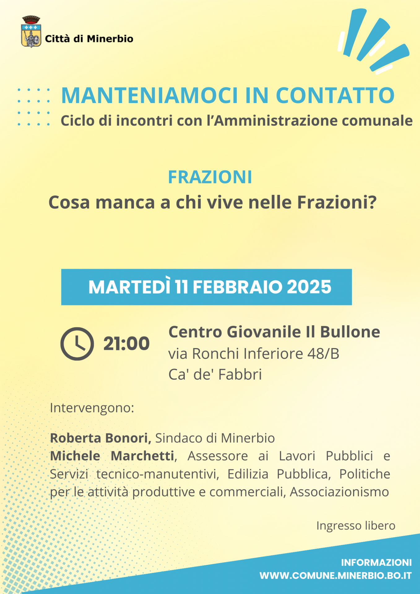 Martedì 11 febbraio 2025, alle ore 21.00 presso il Centro Giovanile Il Bullone - via Ronchi Inferiore 48/B, Ca' de' Fabbri - si terrà il terzo appuntamento dal titolo "Frazioni: cosa manca a chi vive nelle Frazioni?" del ciclo di 7 incontri "Manteniamoci in contatto" che si tengono da dicembre 2024 a giugno 2025, il secondo martedì di ogni mese, per un confronto con l'Amministrazione sui temi di maggiore interesse per i cittadini.