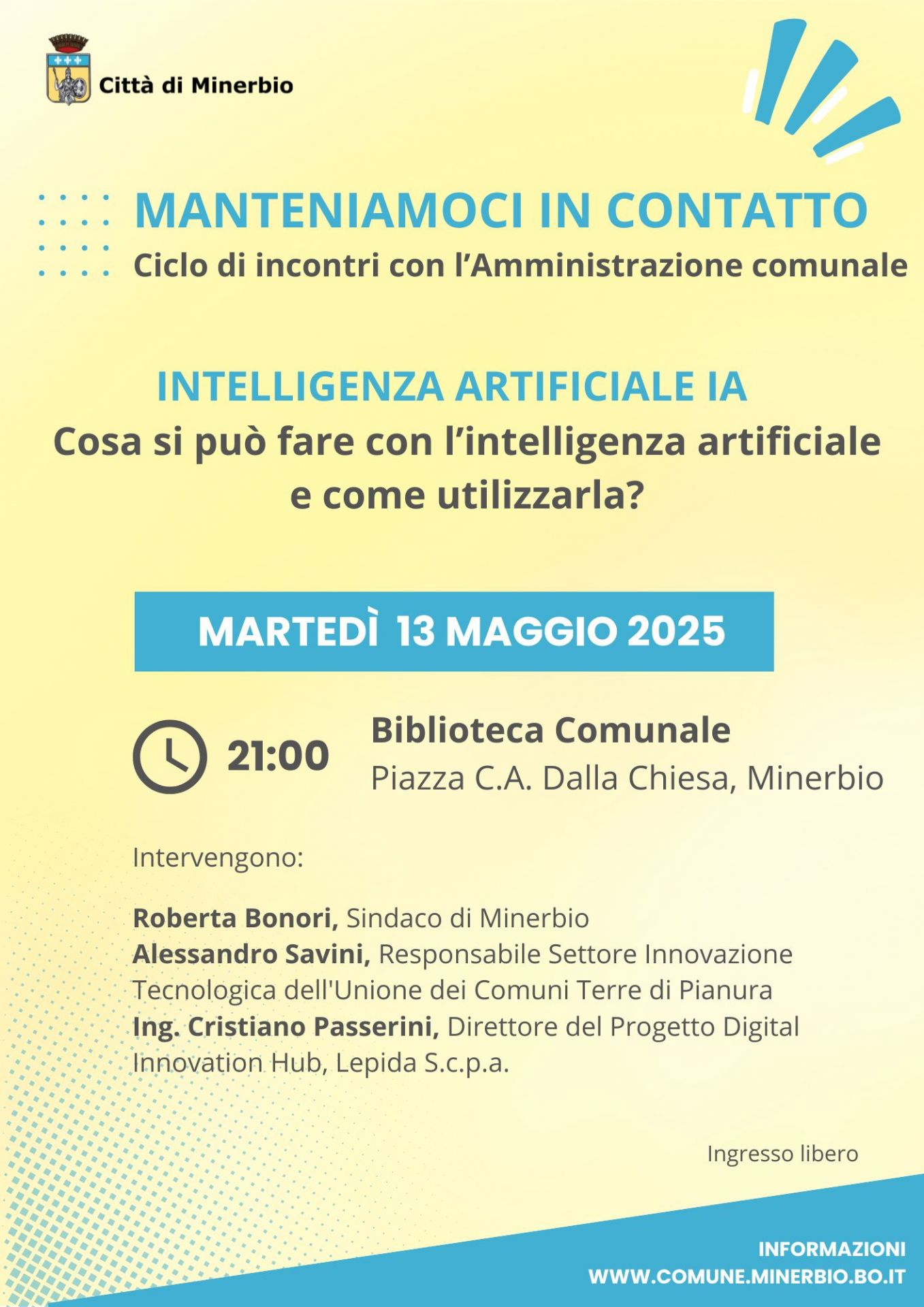 L'Amministrazione comunale di Minerbio invita cittadini, imprese e appassionati di tecnologia a partecipare al prossimo incontro del ciclo Manteniamoci in Contatto, un'opportunità di dialogo e confronto su temi di grande attualità.