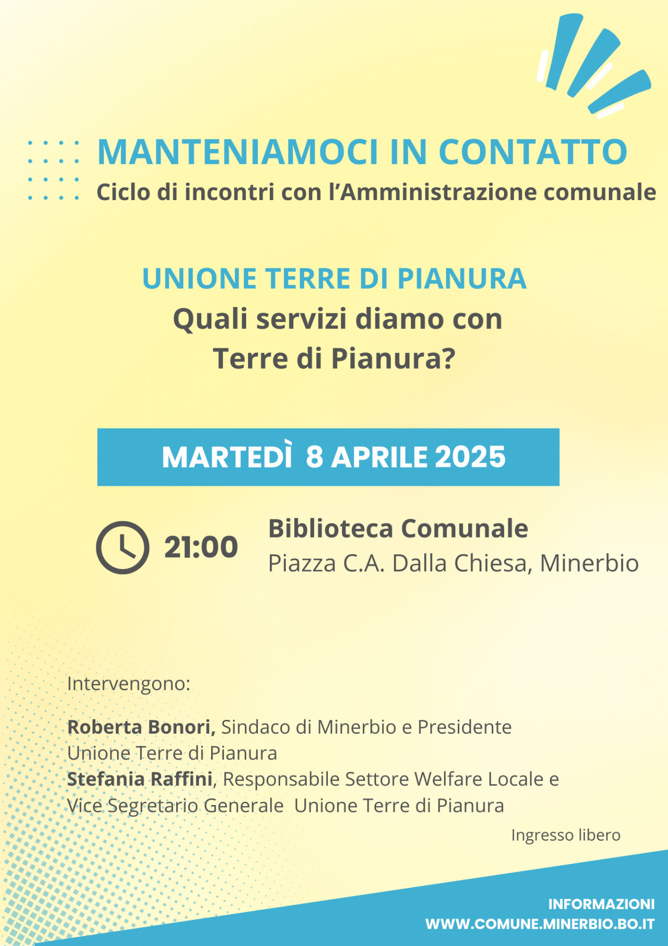 Martedì 8 Aprile 2025, alle ore 21.00 presso la sala Multimediale della Biblioteca Comunale Prometeo di Minerbio, si terrà il quinto appuntamento dal titolo: " Quali servizi diamo con Terre Di Pianura?" del ciclo di 7 incontri "Manteniamoci in contatto" che si tengono da dicembre 2024 a giugno 2025, il secondo martedì di ogni mese, per un confronto con l'Amministrazione sui temi di maggiore interesse per i cittadini.