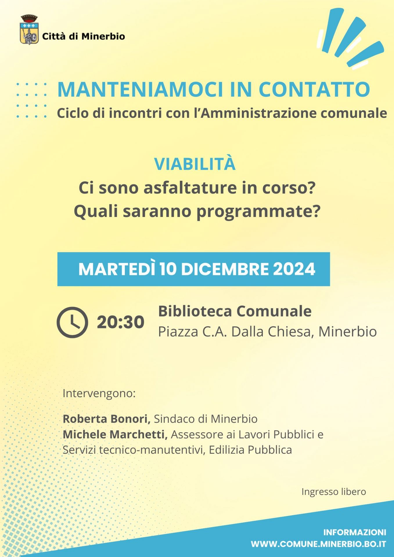 Martedì 10 dicembre 2024 alle ore 20.30 presso la sala multimediale della Biblioteca comunale Prometeo di Minerbio, si terrà il primo appuntamento "VIABILITÀ - Ci sono asfaltature programmate? Quali strade sono interessate?" del ciclo di 7 incontri dal titolo "Manteniamoci in contatto" che si terranno da dicembre 2024 a giugno 2025, il secondo martedì di ogni mese alle 20.30, per confronto con l'Amministrazione sui temi di maggiore interesse per i cittadini.