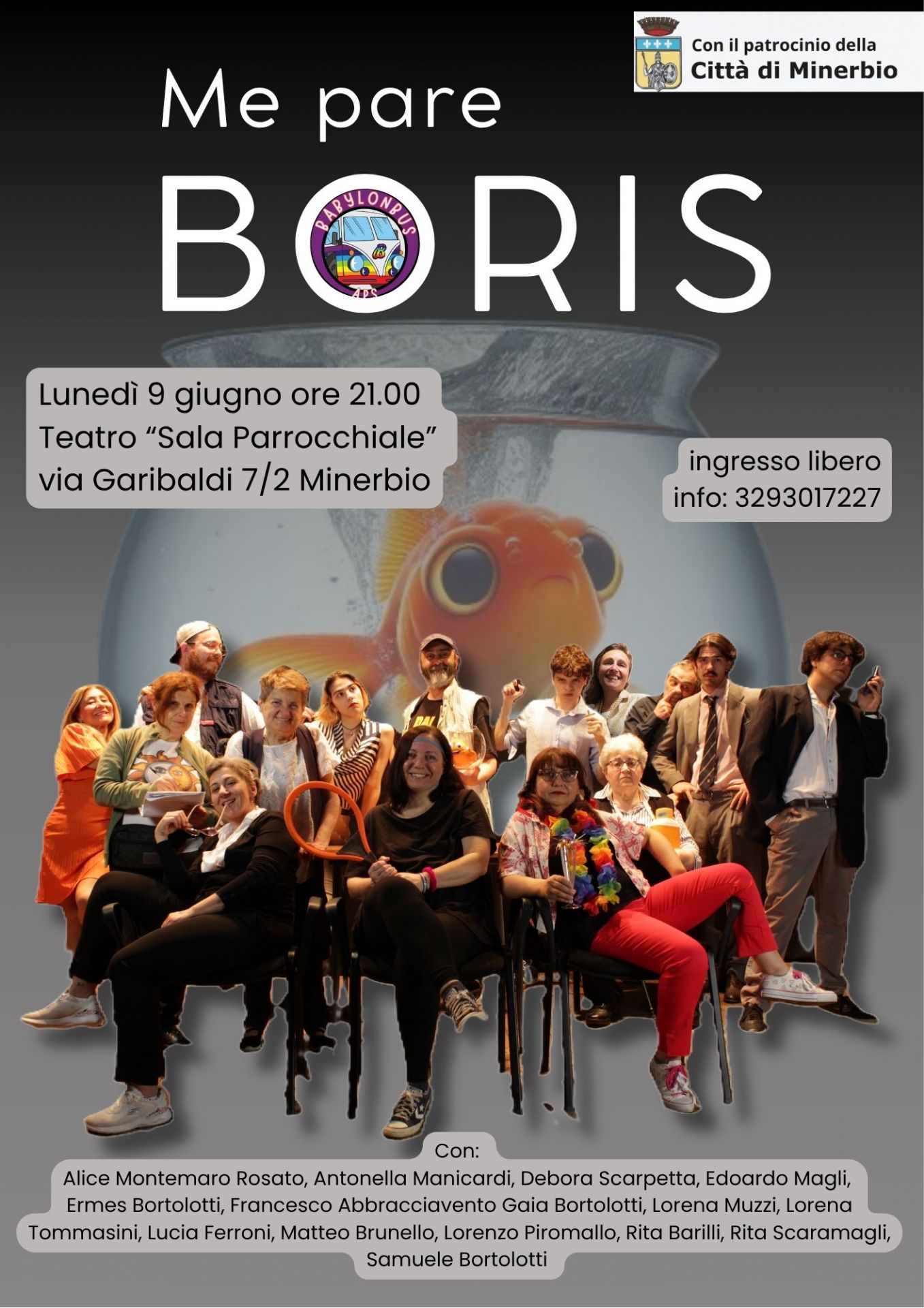 Lunedì 9 giugno 2025 alle ore 21:00, presso il Teatro "Sala Parrocchiale" in via Garibaldi 7/2 a Minerbio, va in scena "Me pare Boris" Lo spettacolo ha ricevuto il patrocinio del Comune di Minerbio, rientrando all’interno del Progetto Insieme.