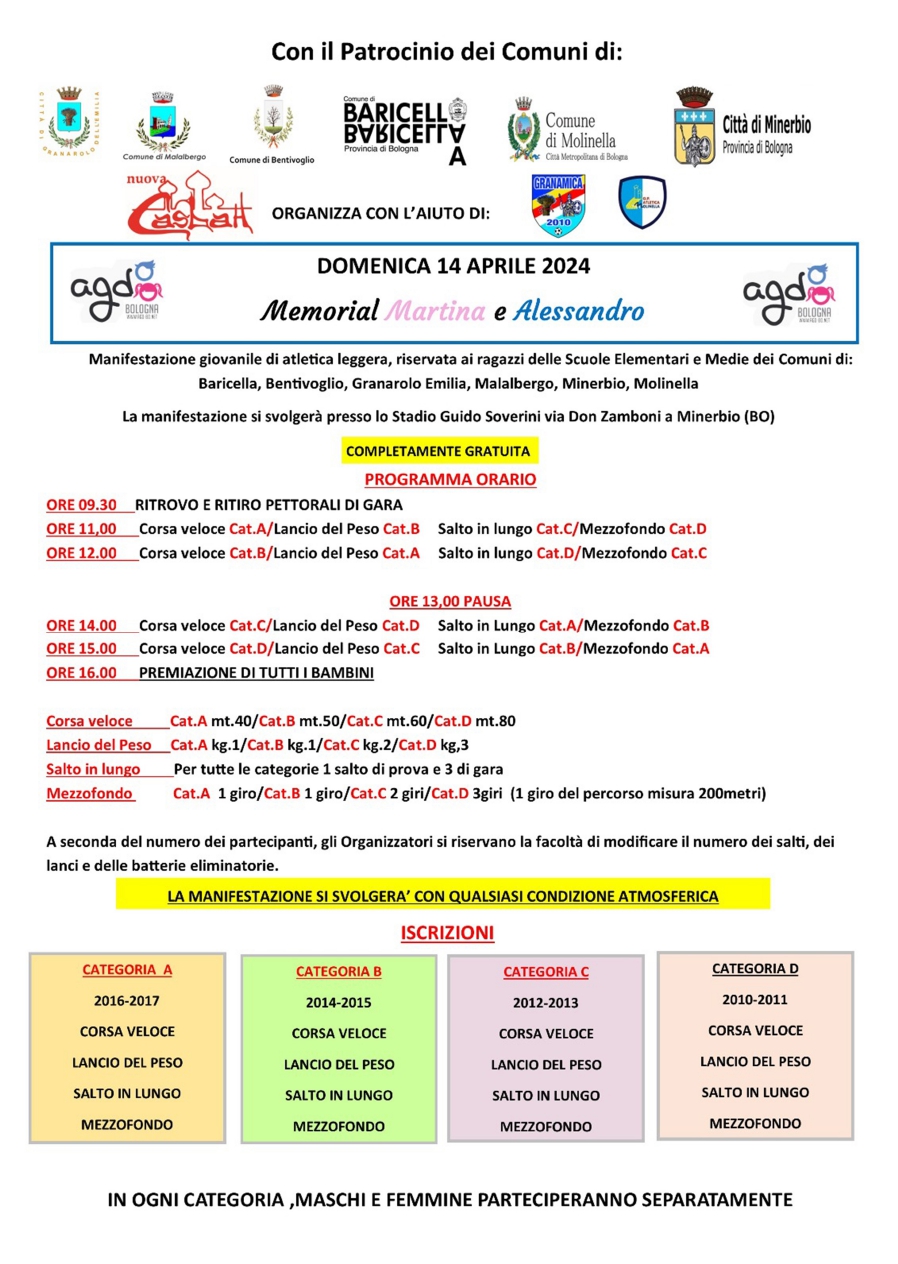Domenica 14 aprile 2024 si terrà il Memorial Martina e Alessandro, presso lo Stadio G. Soverini in via Don Zamboni a Minerbio, a partire dalle ore 9.30.