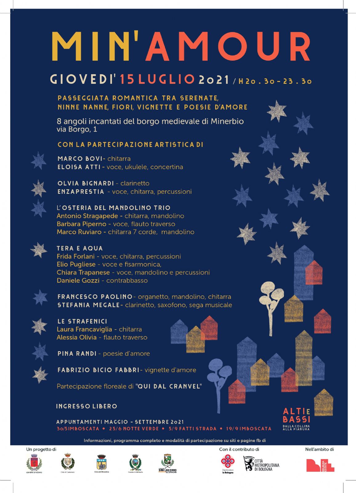 Il borgo medievale di Minerbio giovedì 15 luglio farà da sfondo all'evento Min’Amour: l'appuntamento inserito nella rassegna estiva Alti e bassi realizzata in collaborazione con i Comuni di Castenaso, Budrio, Molinella e San Lazzaro. Una passeggiata romantica sotto le stelle, in cui gli ingredienti saranno la rivalutazione del patrimonio artistico e l'arte come pretesto romantico per godere e apprezzare il territorio.