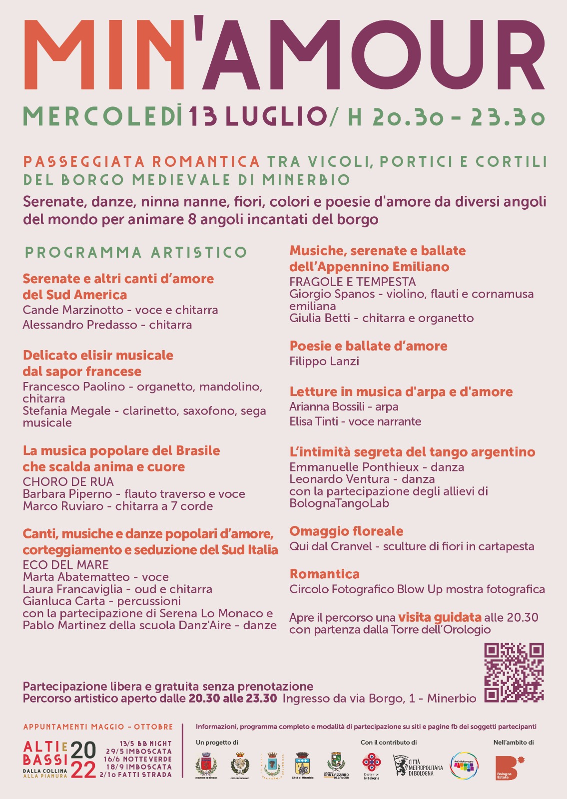 L'evento comincerà alle ore 20.30 con una visita guidata del Borgo. Appuntamento alla Torre dell'orologio. A seguire si articolerà tra musica, serenate, ninne nanne, fiori, danza e poesie d’amore realizzati in otto angoli incantati del borgo medievale di Minerbio che prenderanno vita e ospiteranno esibizioni musicali e grafiche.