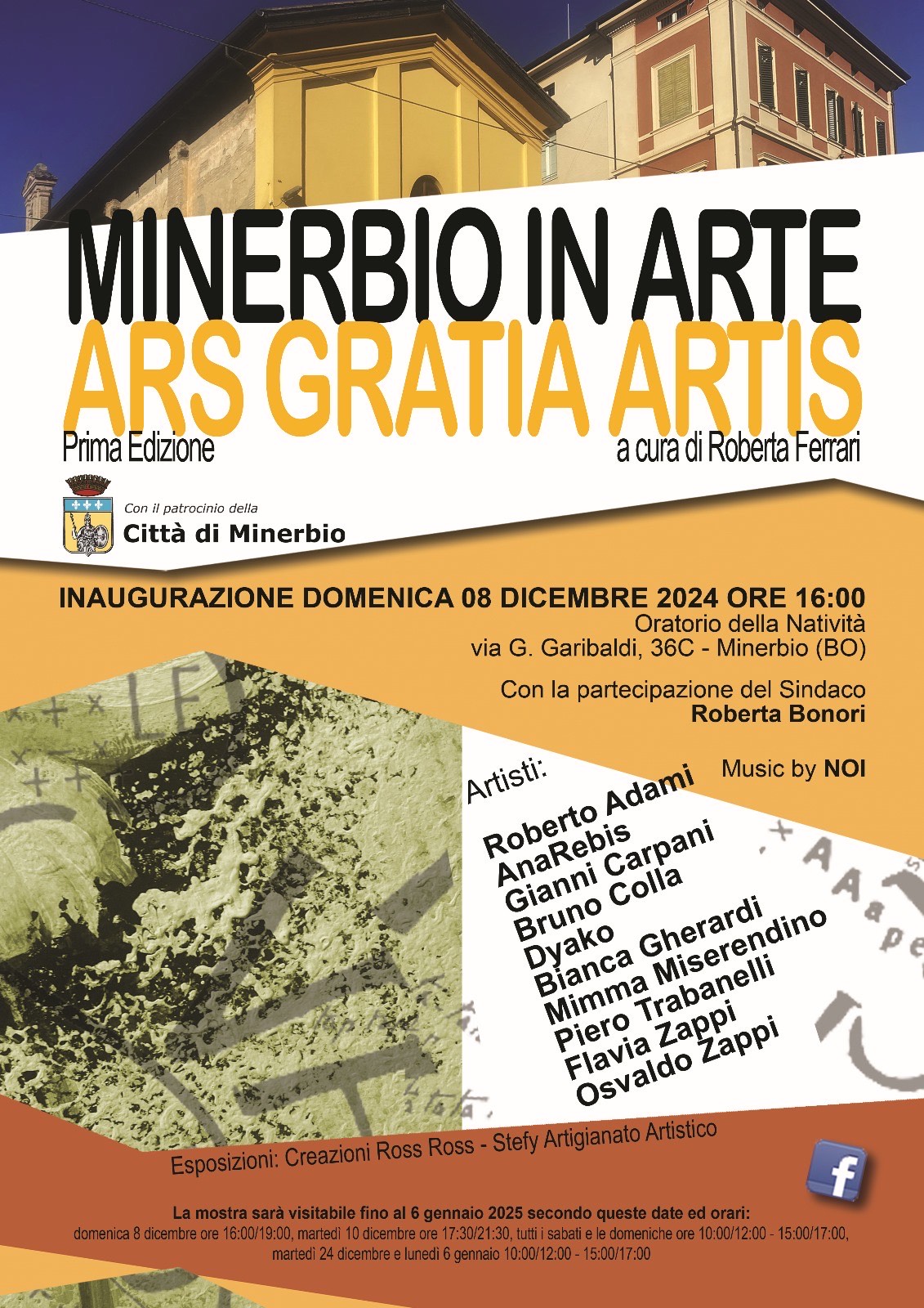 Domenica 8 dicembre 2024 alle ore 16.00 nell'Oratorio della Natività in via G. Garibaldi 36/c a Minerbio si terrà l'inaugurazione della mostra dal titolo "Minerbio in arte. Ars gratia artis" a cura di Roberta Ferrari, con il patrocinio del Comune di Minerbio e i saluti del Sindaco Roberta Bonori.