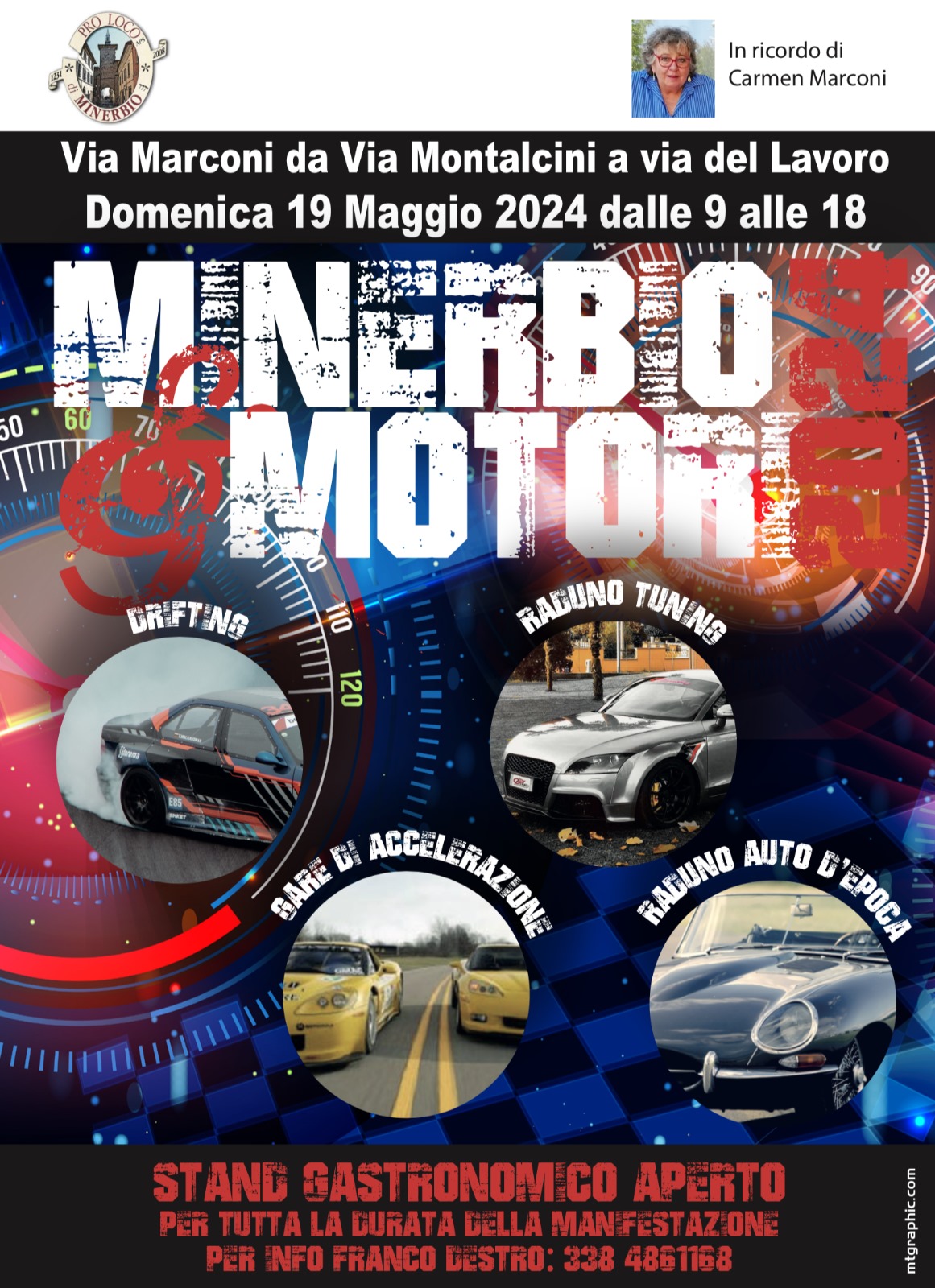 Domenica 19 maggio 2024 dalle ore 9.00 alle ore 18.00 in via Marconi da via Montalcini a via Del Lavoro torna Minerbio & Motori, in ricordo di Carmen Marconi.