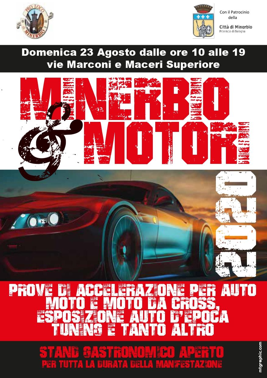 Domenica 23 Agosto, dalle ore 10 alle 19, per le vie Marconi e Maceri Superiore, si terrà l'edizione 2020 di Minerbio&Motori: prove di accelerazione per auto, moto e moto da cross, esposizione auto d'epoca.