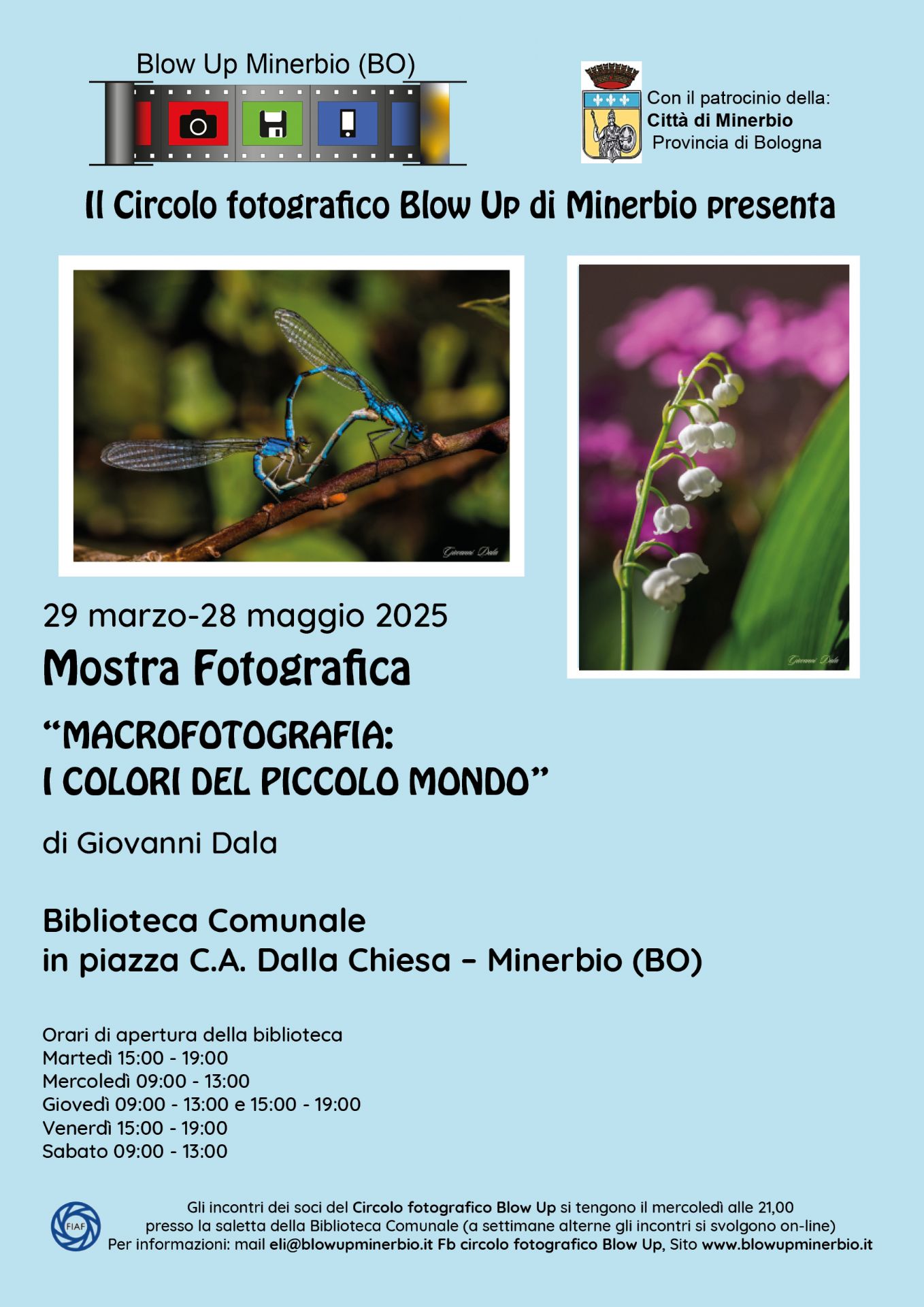Sabato 29 marzo 2025, il circolo fotografico Blow up, con il patrocinio del Comune di Minerbio, alle ore 11.00 presso la Biblioteca Comunale di Minerbio inaugura la mostra fotografica dal titolo: mostra di macrofotografia.