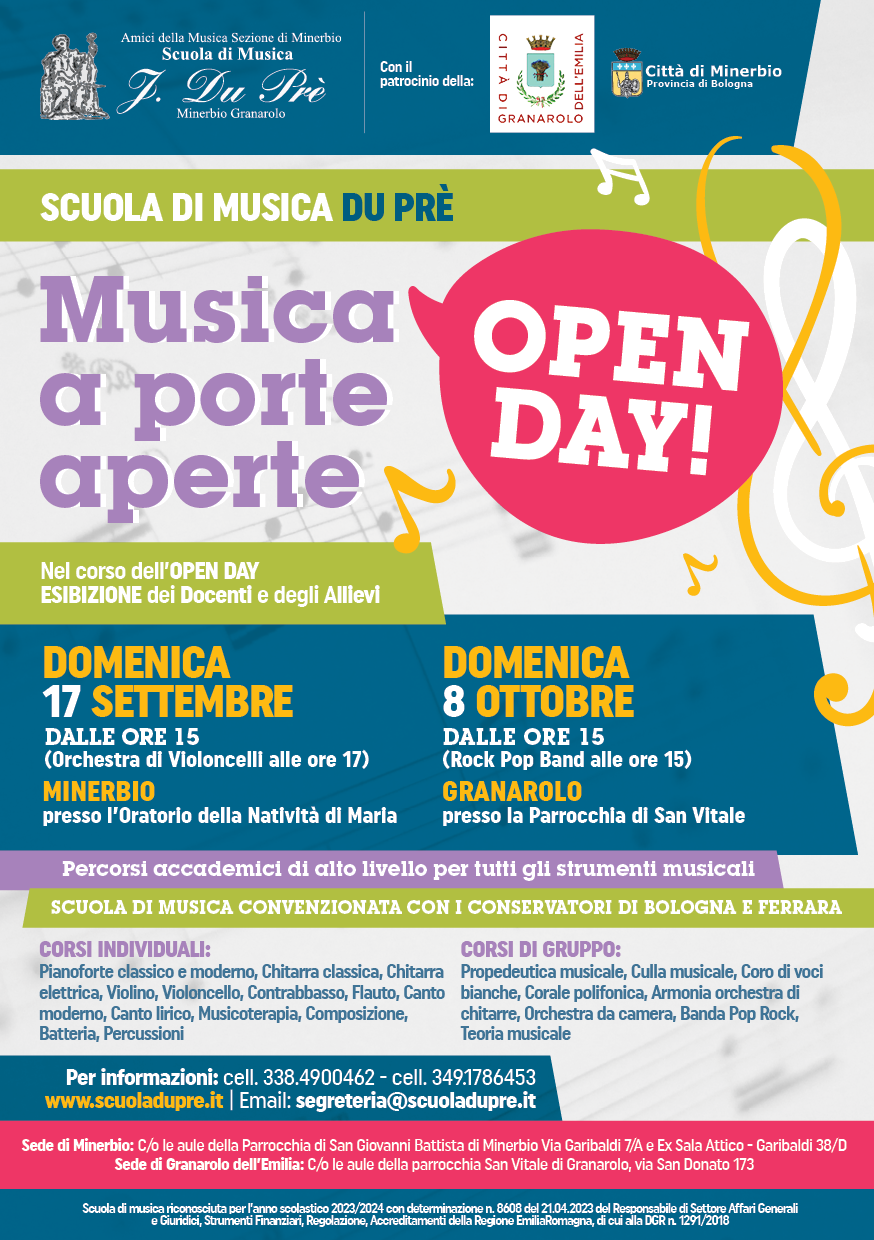 Domenica 17 settembre 2023 dalle ore 15.00 alle ore 19.00 a Minerbio presso l'Oratorio della Natività di Maria (via G. Garibaldi, 36) la Scuola di Musica Du Prè organizza un Open Day "Musica a porte aperte" per i percorsi accademici per tutti gli strumenti musicali.