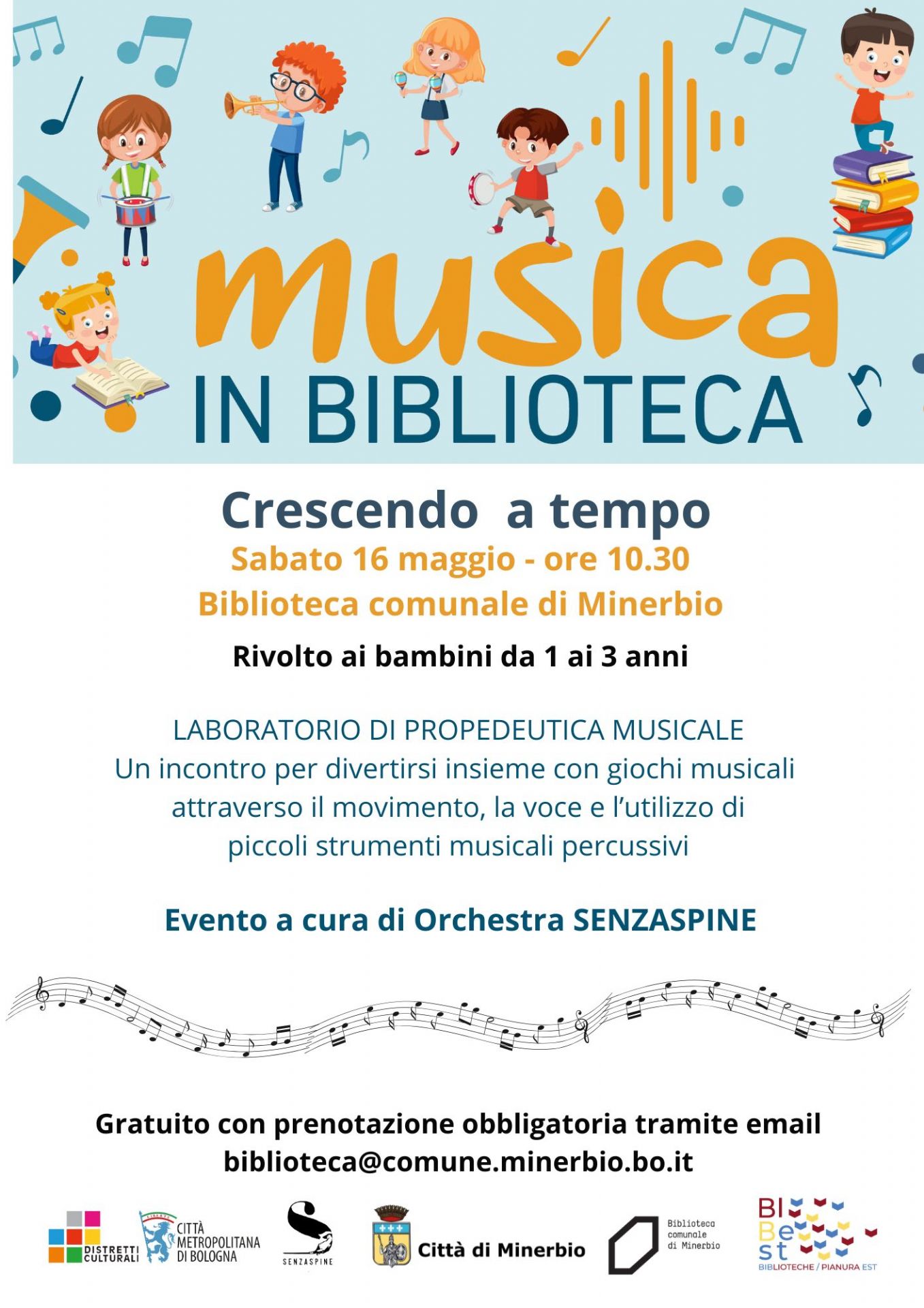 Sabato 16 maggio 2026 alle ore 10,30 alla Biblioteca Comunale Prometeo di Minerbio si terrà un laboratorio di propedeutica musicale "Musica in biblioteca - Crescendo a tempo" .