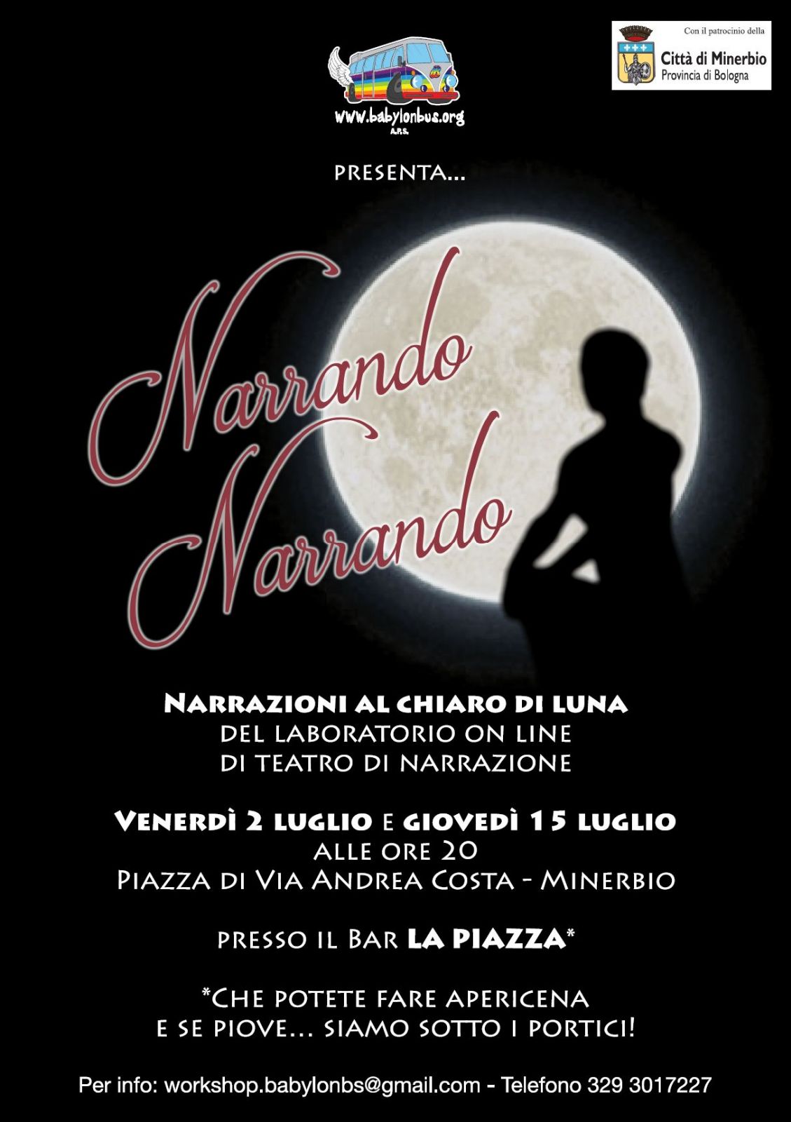 Venerdì 2 e giovedì 15 luglio 2021, l'Associazione culturale Babylonbus propone "Narrando Narrando", narrazioni al chiaro di Luna del Laboratorio online del teatro di narrazione.