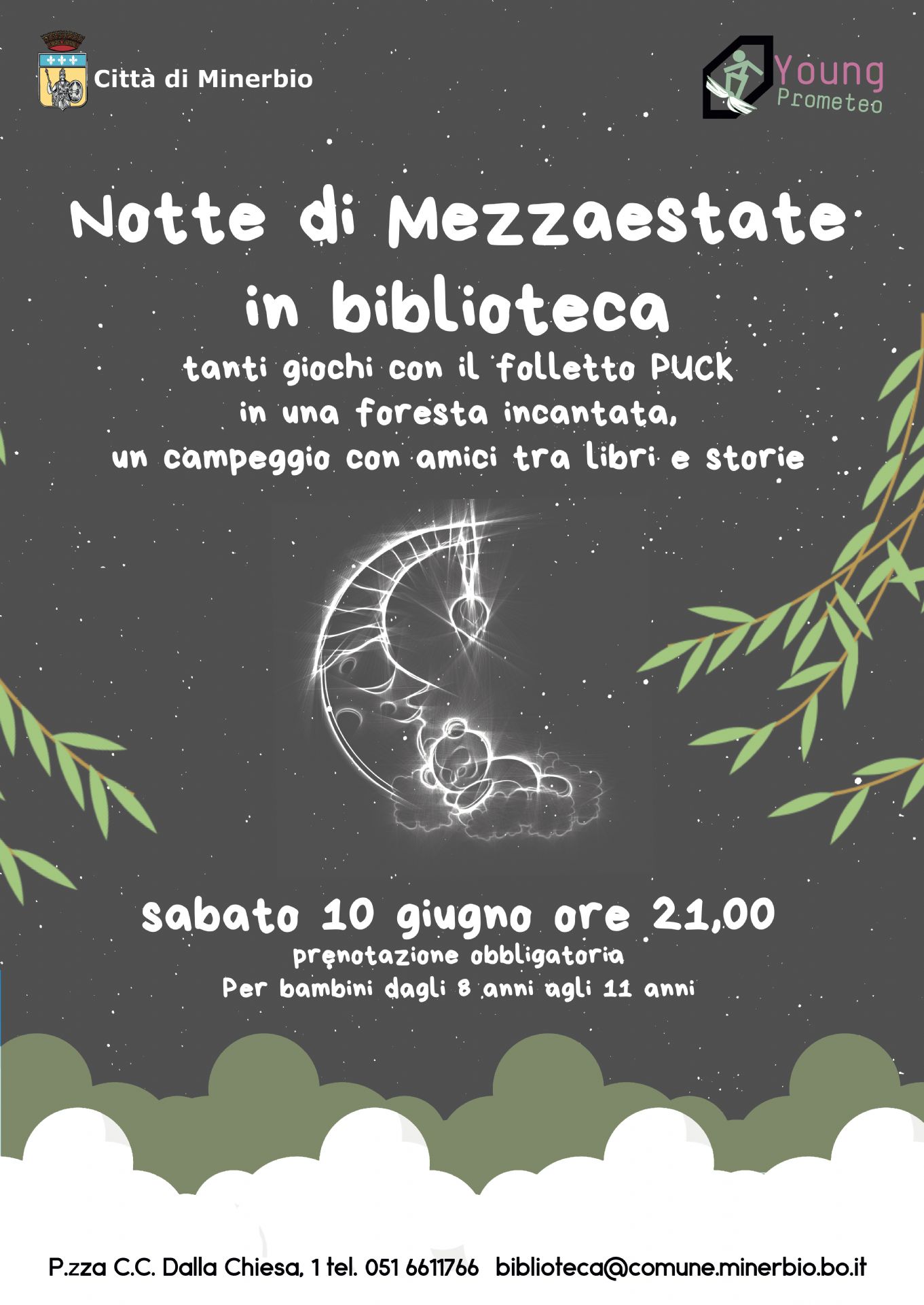 Sabato 10 giugno 2023 si svolgerà presso la Biblioteca Comunale Prometeo di Minerbio dalle ore 21.00 la Notte di Mezza Estate in Biblioteca, per bambine e bambini dagli 8 agli 11 anni.