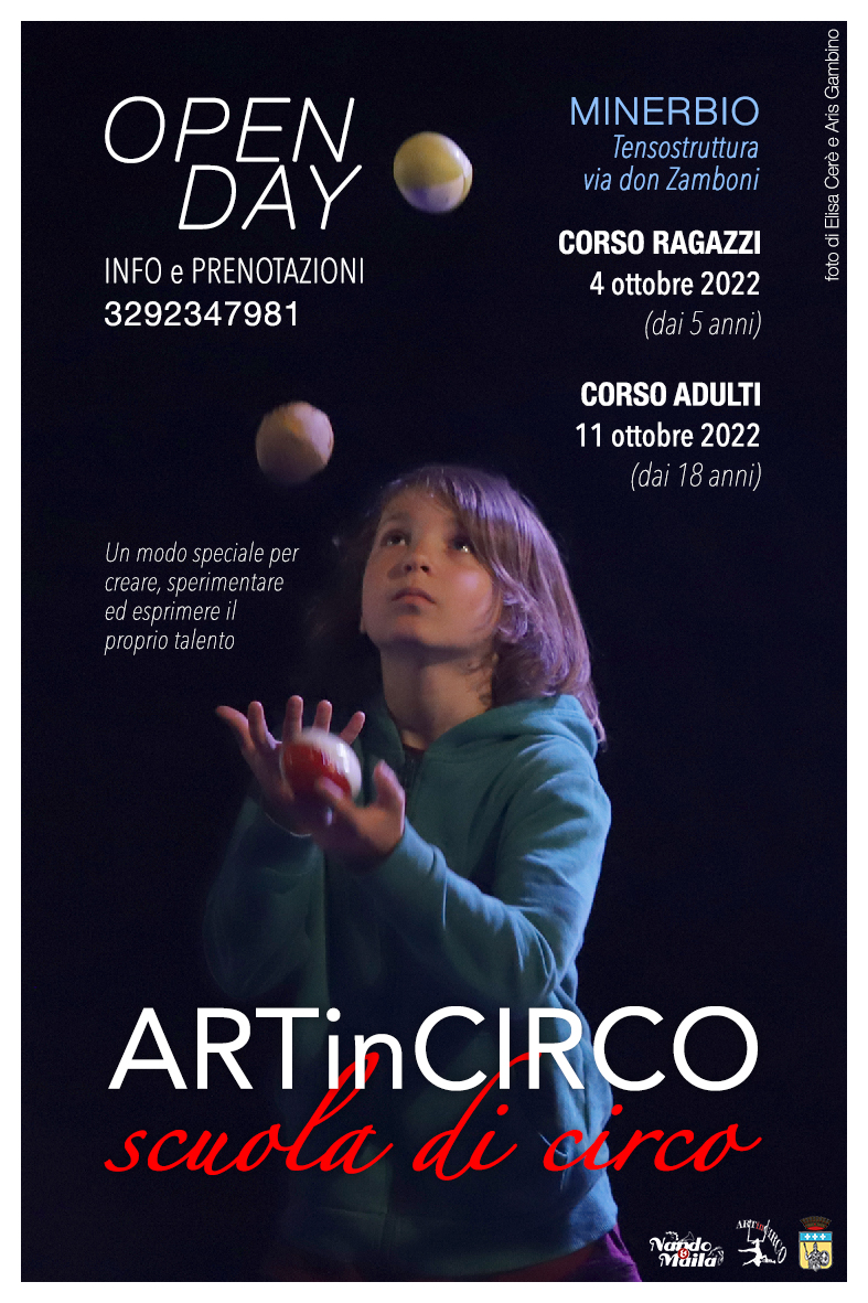 Presso la tensostruttura in via Don Zamboni a Minerbio, martedì 4 ottobre (dai 5 anni) e martedì 11 ottobre (dai 18 anni) si terranno due Open Day della scuola di circo ARTinCIRCO.