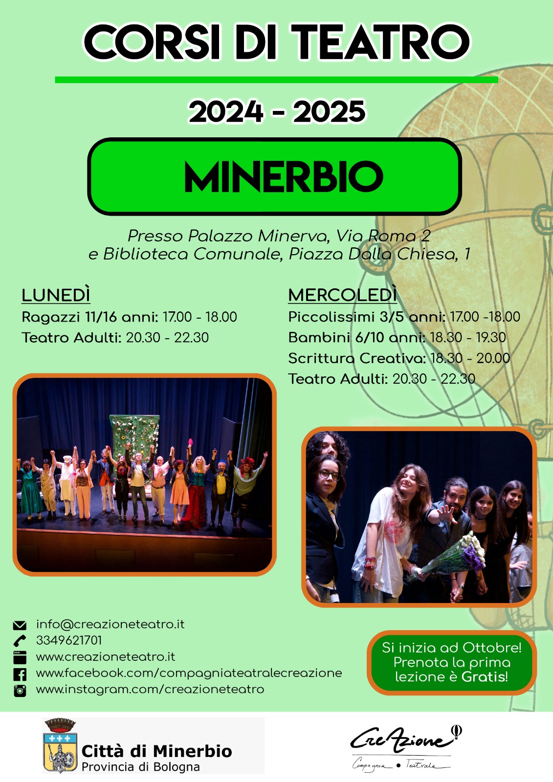 Da lunedì 7 ottobre ripartono a Minerbio i corsi di CreAzione Aps pressp il teatro Palazzo Minerva e la sala multimediale della Biblioteca Comunale.