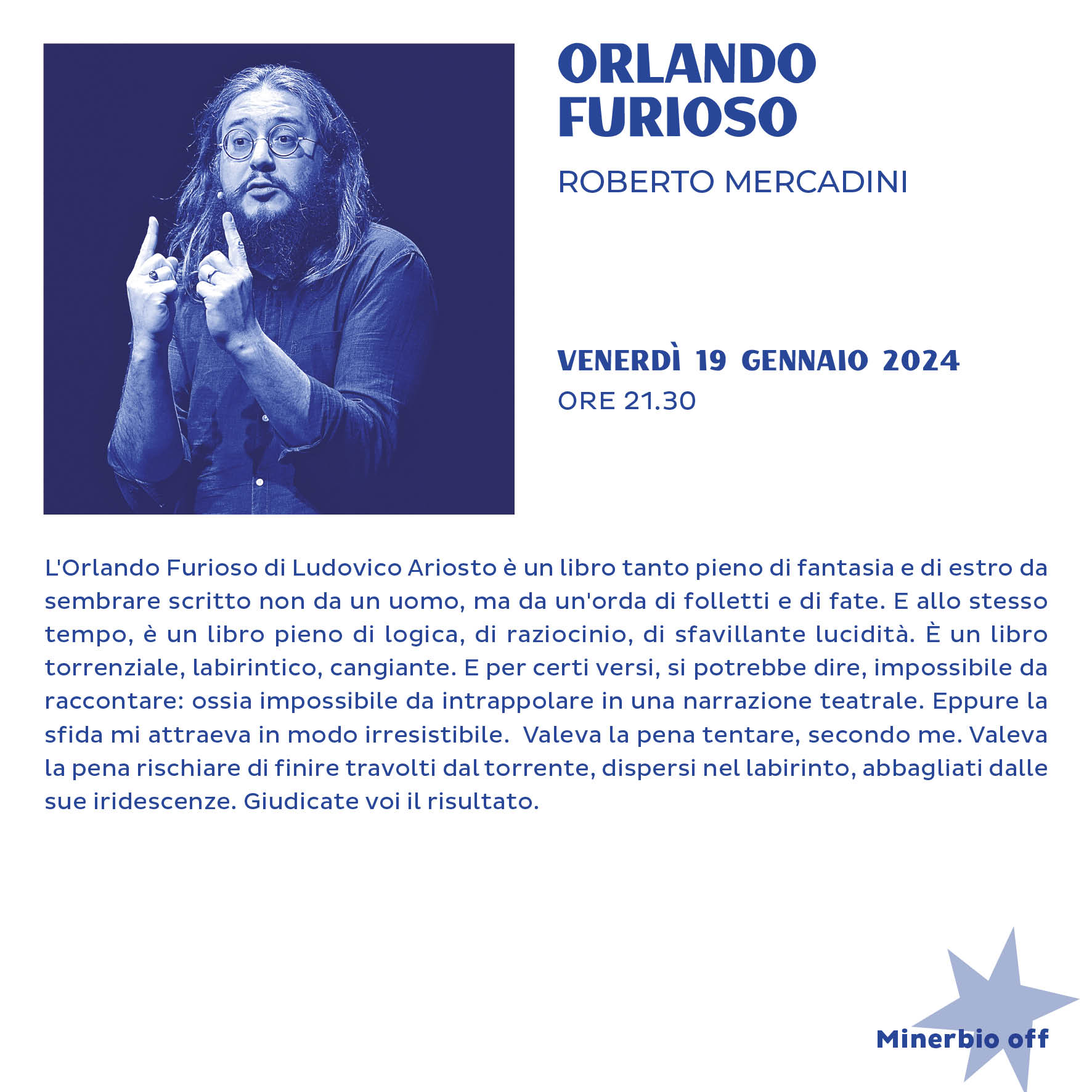 Venerdì 19 gennaio 2024 alle ore 21.30, primo appuntamento della rassegna Minerbio Off della stagione teatrale 2022/2023 di Palazzo Minerva.