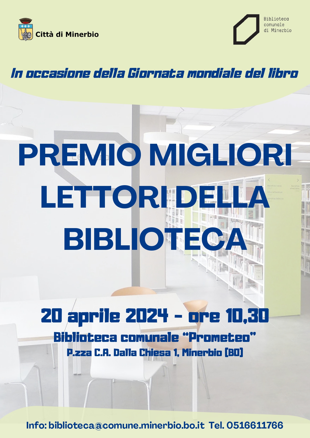 Sabato 20 aprile 2024 alle ore 10.30 in Biblioteca Comunale Prometeo di Minerbio, in occasione della Giornata Mondiale del Libro,, si terrà la premiazione dei lettori più assidui della biblioteca.