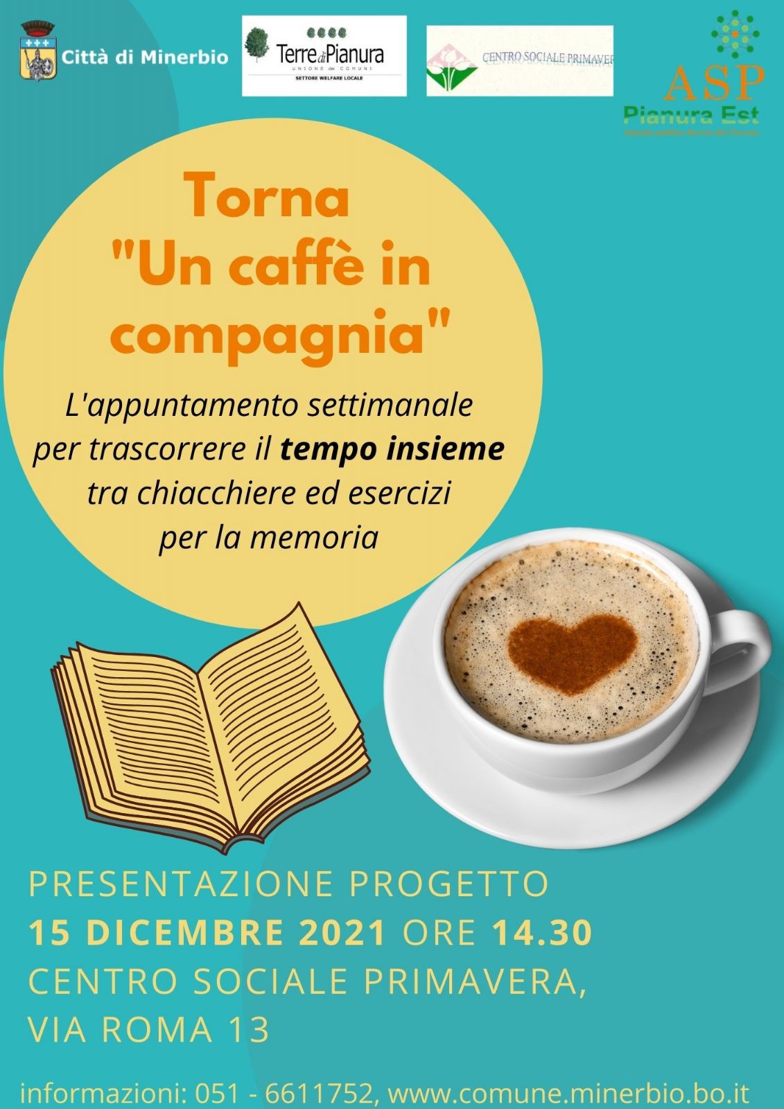 Torna l'appuntamento per trascorrere il tempo insieme tra chiacchiere e compagnia, stimolando la memoria e aiutando le occasioni di socializzazione. Si chiama "Un caffè in compagnia", ed è un progetto giunto alla sua seconda edizione e promosso dal Comune di Minerbio, dall'Unione Terre di Pianura con il sostegno dell'Asp Pianura Est e del Centro Sociale Primavera.