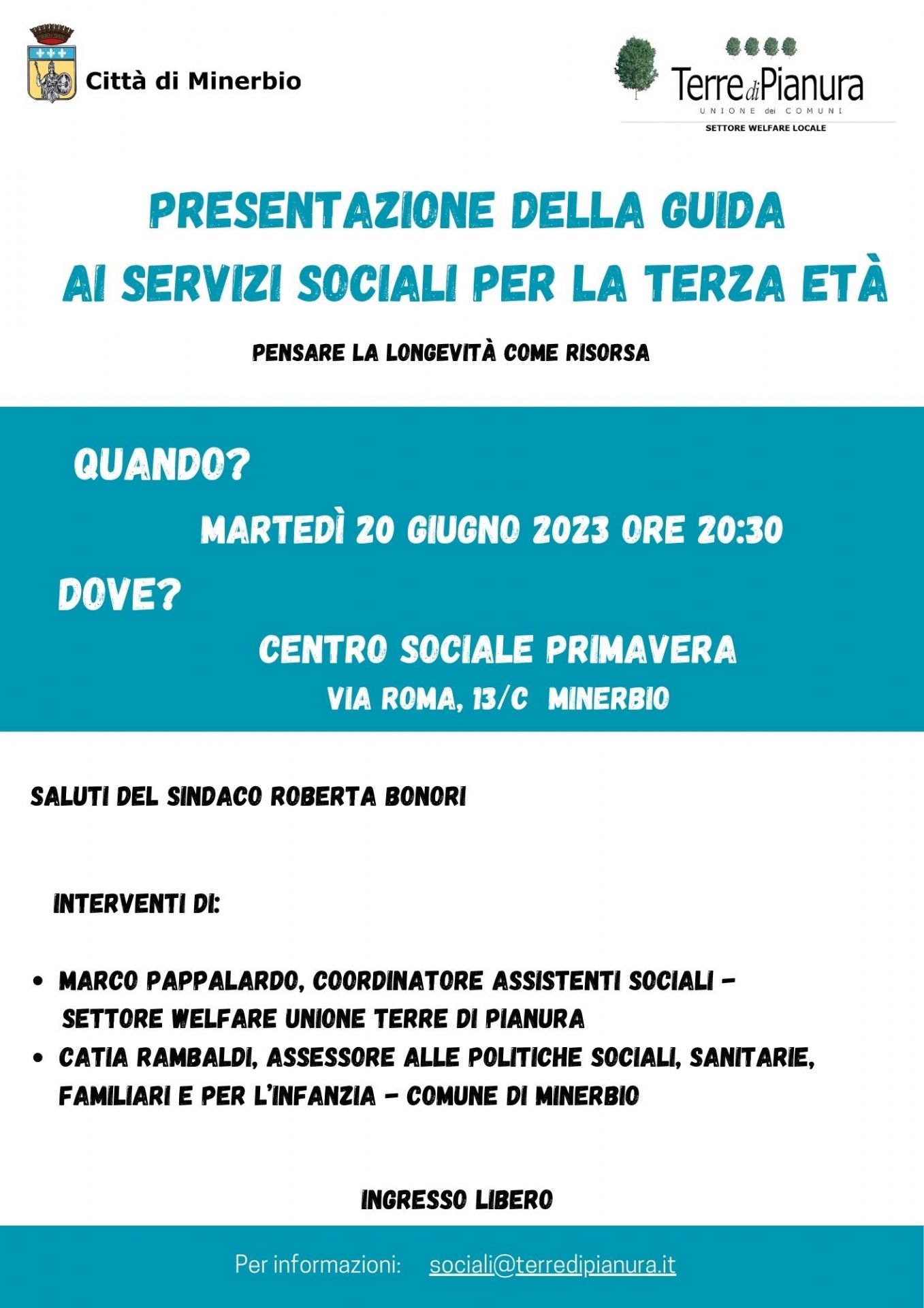 Martedì 20 giugno alle ore 20.30 presso il Centro Sociale Primavera di Minerbio, verrà presentata la Guida ai servizi sociali per per la terza età, realizzato dal Settore Welfare Locale dell'Unione Terre di Pianura.
