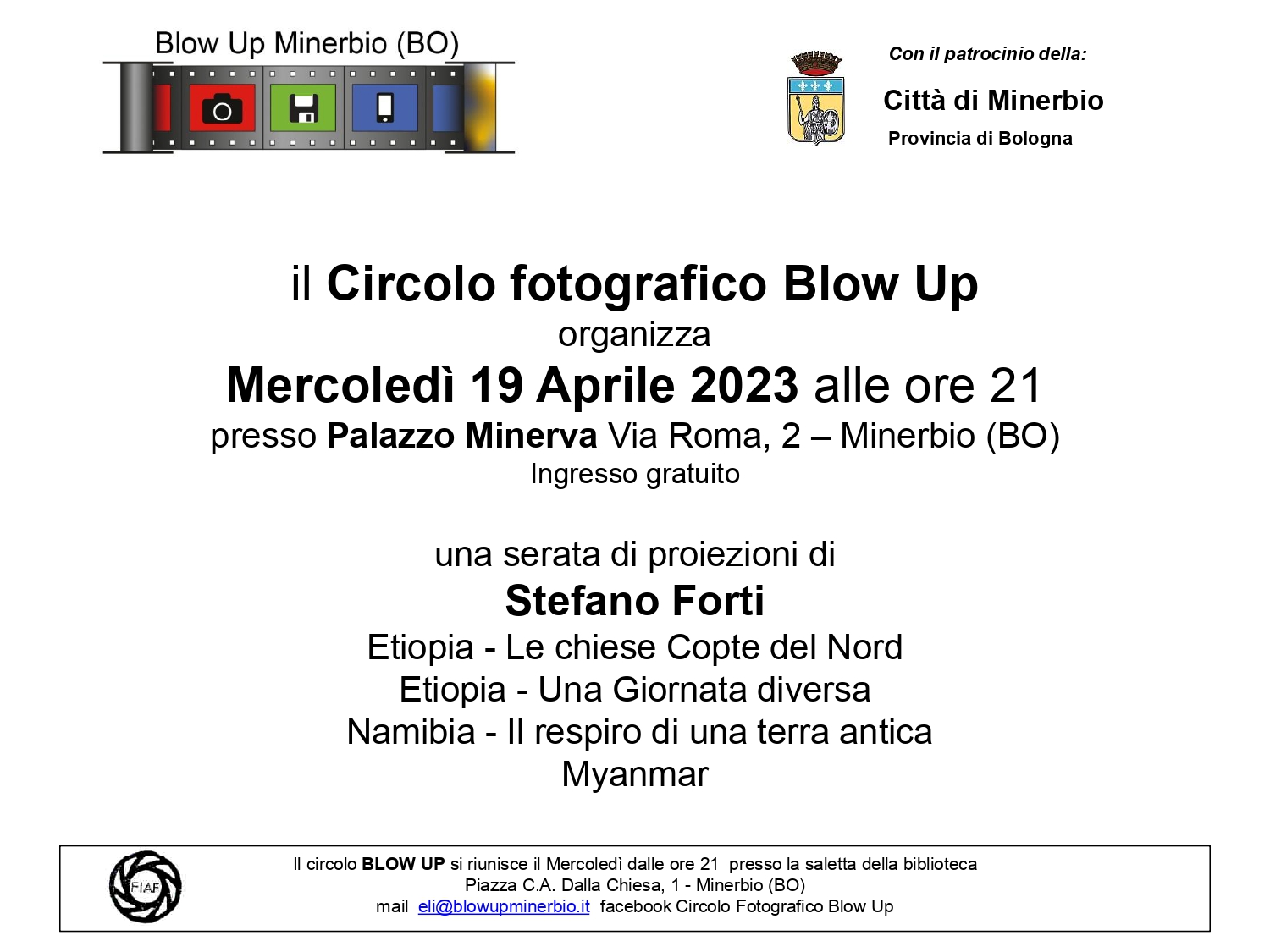 Il Circolo Fotografico Blow up organizza mercoledì 19 aprile 2023 alle ore 21.00 presso il teatro Palazzo Minerva una serata dedicata alle proiezioni di STEFANO FORTI: