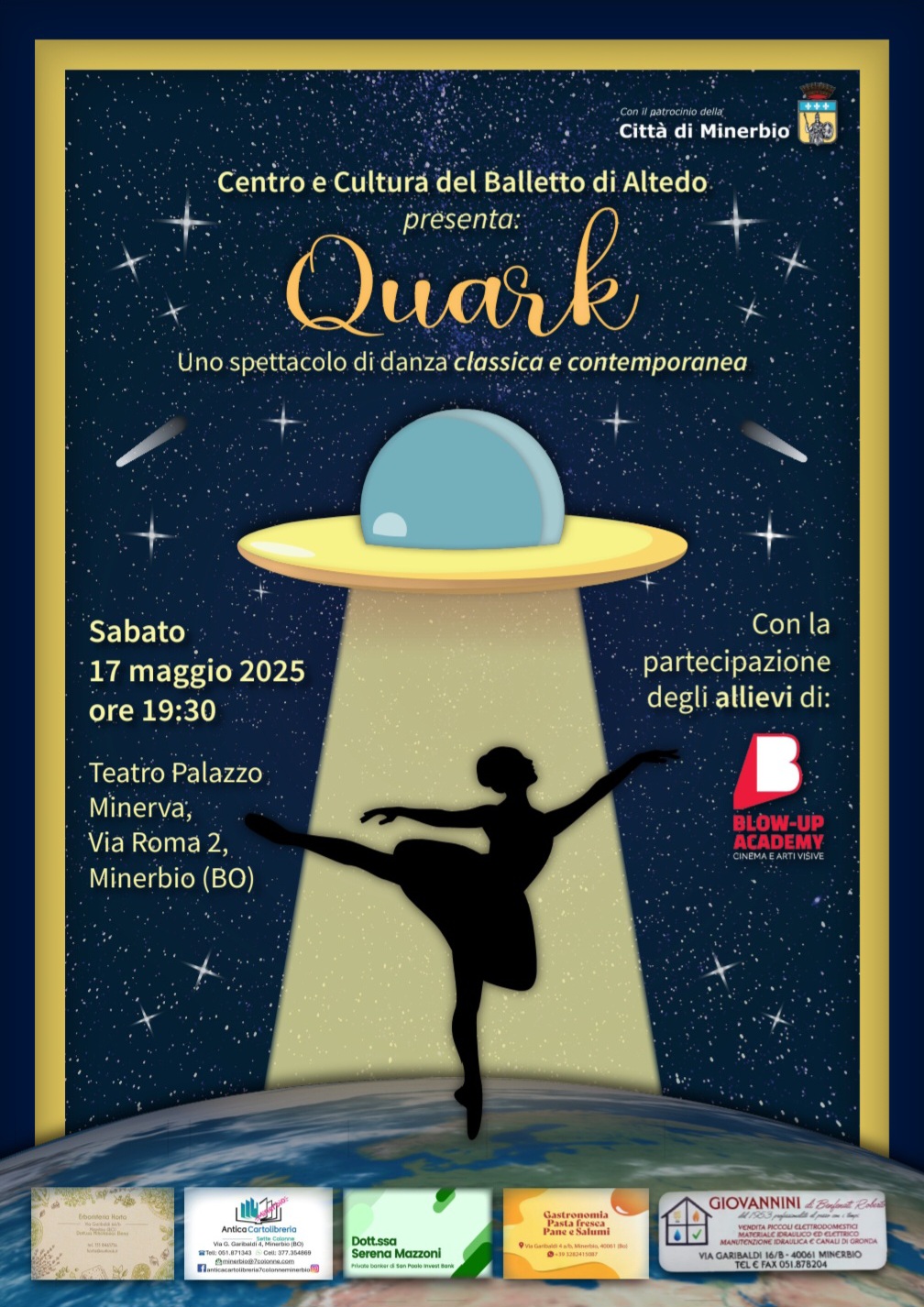 Il Centro e Cultura del Balletto di Altedo, con il patrocinio del Comune di Minerbio, presenterà "Quark", uno spettacolo di danza classica e contemporanea che vedrà la partecipazione degli allievi della Blow Up Academy.