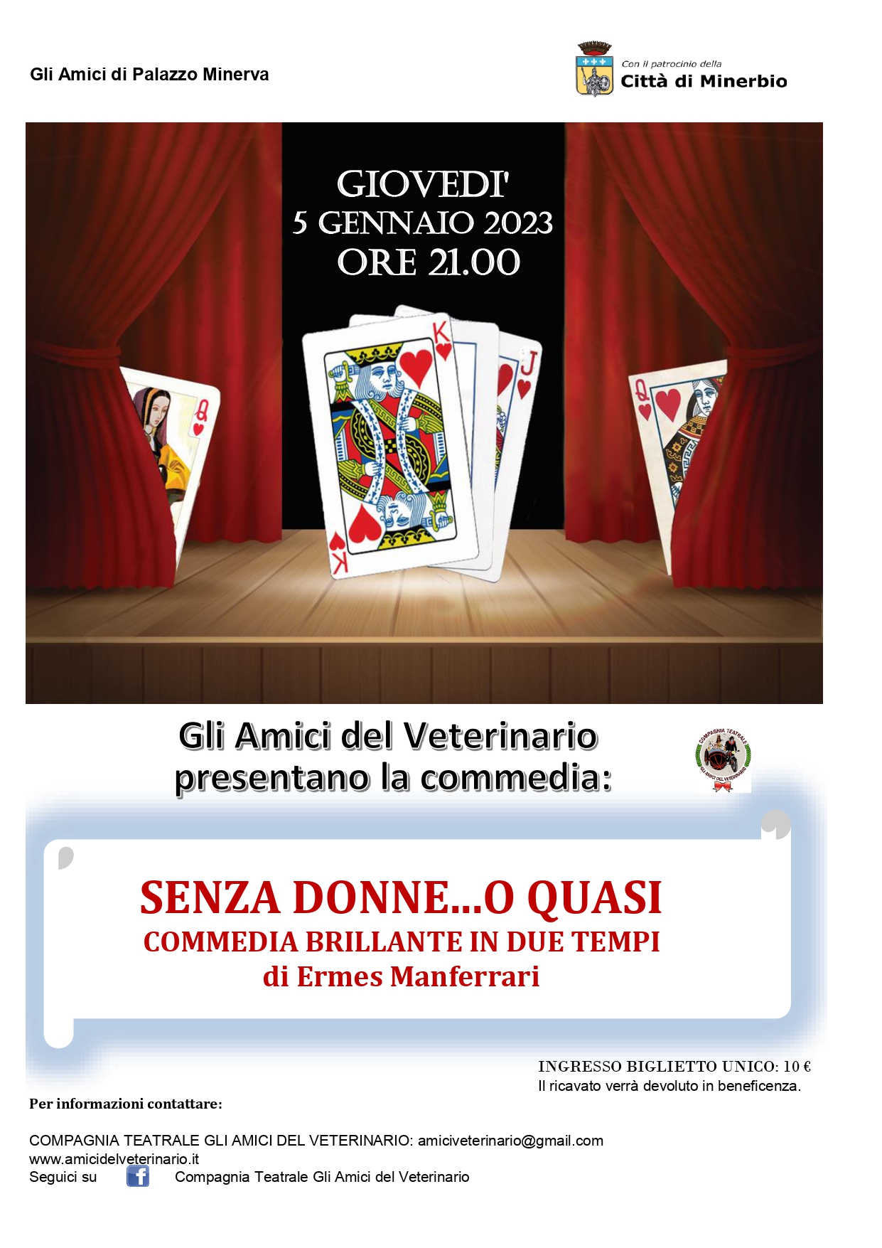 Gli Amici del Veterinario presentano, giovedì 5 gennaio 2023 alle ore 21.00 presso Palazzo Minerva, la commedia "Senza donne... o quasi", commedia brillante in due tempi di Ermes Manferrari.
