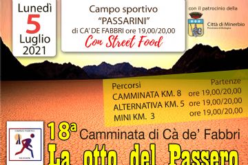 Lunedì 5 luglio dalle ore 19 alle ore 20, torna l'evento sportivo dell'estate, la camminata "otto del Passero" giunta alla sua 18esima edizione. La partenza sarà a Cà de Fabbri da via Ronchi...