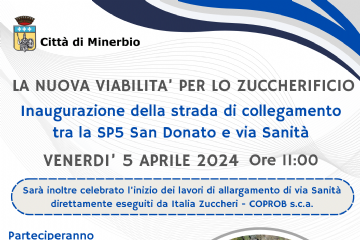 Venerdì 5 aprile 2024 alle ore 11.00 si terrà l'inaugurazione della strada di collegamento tra SP5 San Donato e via Sanità per la nuova viabilità...