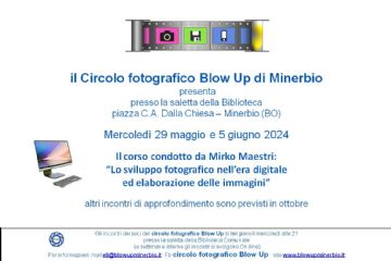 Il circolo fotografico Blow up presenta mercoledì 31 gennaio 2024 alle ore 21.00 presso la saletta multimediale della Biblioteca comunale in Piazza C.A. Dalla Chiesa a Minerbio il primo incontro...