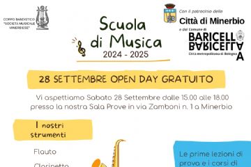 Sabato 28 settembre 2024 dalle ore 15.00 alle ore 18.00 nella Sala Prove in via Zamboni n. 1 a Minerbio si terrà l'Open Day gratuito della Scuola...