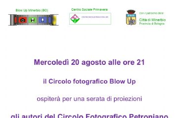 Il circolo fotografico Blow Up ospita una serata di proiezioni con gli autori del Circolo Fotografico Petroniano. Mercoledì 20 Agosto alle ore 21, presso il cortile coperto del Centro Sociale...