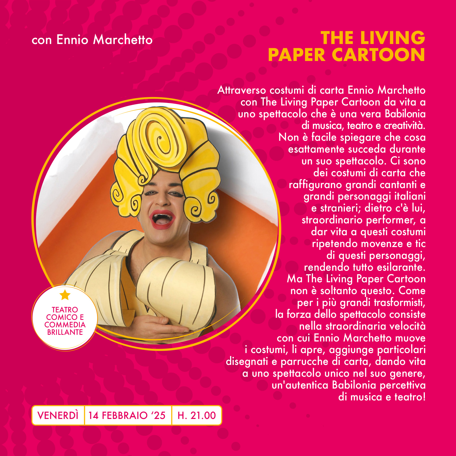 Non è facile spiegare che cosa esattamente succeda durante un suo spettacolo. Ci sono dei costumi di carta che raffigurano grandi cantanti e grandi personaggi italiani e stranieri; dietro c'è lui, straordinario performer, a dar vita a questi costumi ripetendo movenze e tic di questi personaggi, rendendo tutto esilarante. Ma The Living Paper Cartoon non è soltanto questo. Come per i più grandi trasformisti, la forza dello spettacolo consiste nella straordinaria velocità con cui Ennio Marchetto muove i costumi, li apre, aggiunge particolari disegnati e parrucche di carta, dando vita a uno spettacolo unico nel suo genere, un'autentica Babilonia percettiva di musica e teatro!